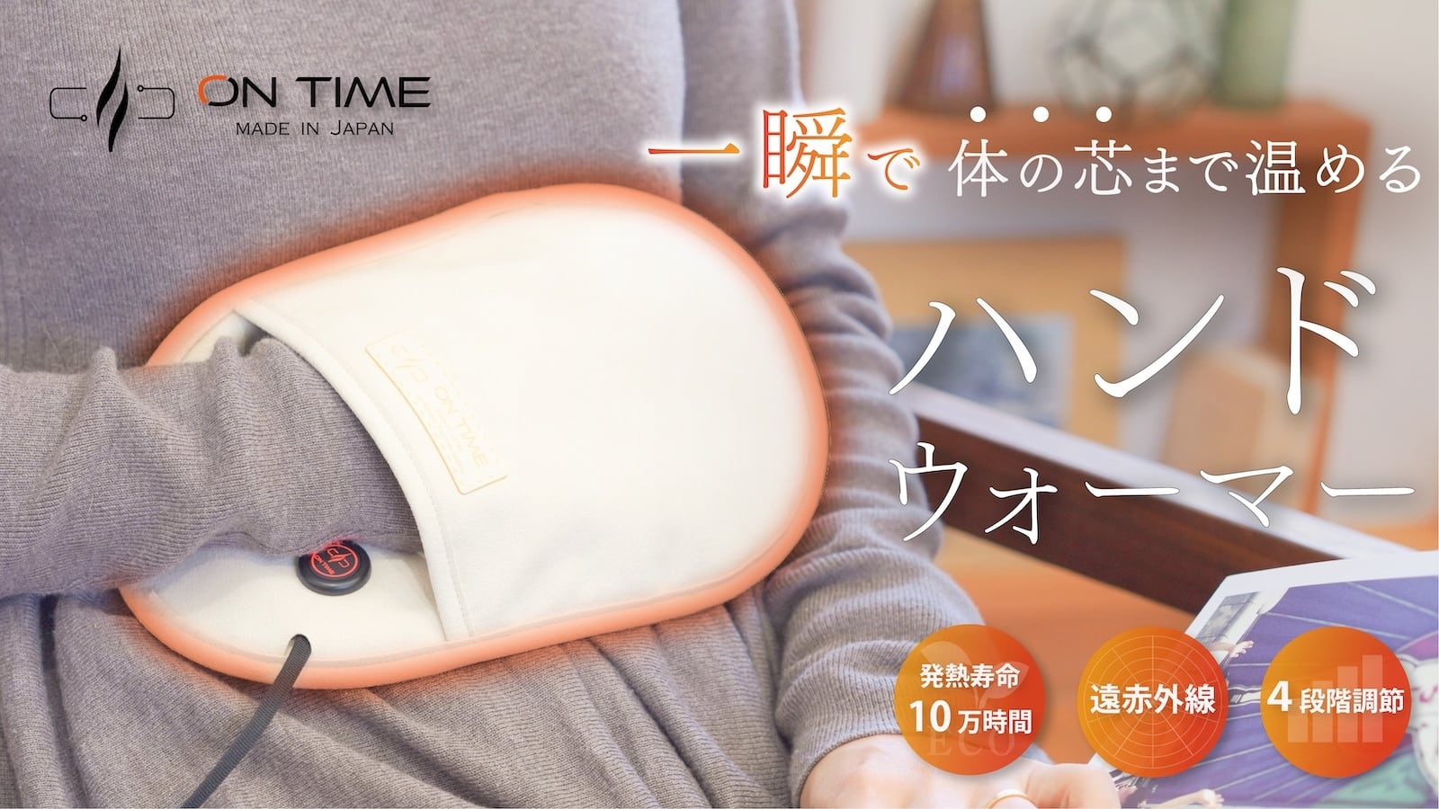 ハンドウォーマーは、手のひらや指先はもちろん、顔・首・肩・お腹・腰まで温められます。 マルチに使えて一瞬で温まる、寒い季節には欠かせないアイテムになるはず。 発熱寿命は10万時間で、毎日8時間使っても約34年も使えるからエコで経済的。 クリーム・ネイビーは数量限定の新色です。 お早めにご購入ください。 -ON TIME- は、時間を大切にするすべての方に向けて生まれたブランドです。ストレスが多く忙しい日々の中でも、手軽な温かさと快適さを提供し、あなたのいきいきとした毎日を応援することをコンセプトにしています。 〔特徴〕 ・遠赤外線ヒーターで発熱寿命は10万時間( 毎日8時間使っても約34年も使える) ・4段階の温度調節ができて、38℃、42℃、46℃、50℃と低温から高温まで使える ・約1秒で発熱。 ・ヒーターや綿が中に入っていても重さは約66g、約5mmの薄さ ・日本の縫製工場ならではの技術力でこの薄さを実現 ・コードの長さは、新幹線や飛行機でもコンセントに届くちょうどいい1m ・電気代は1時間当たり0.31円で経済的 ・1時間の自動OFF機能 ・表生地には肌触りのいい日本製高級人工スウェードを使用 ・ショートによる危険事故(高温・低温やけど)防止の安全回路 ・低温やけど防止の温度センサー搭載 ・折り曲げ耐性1万回以上 ・各種耐性検査合格(RoHS、PSEマーク、CEマーク取得)したヒーターを採用 【カラー】ライトグレー・チャコール・クリーム・ネイビー 【重量】約66g 【操作温度】 50℃(赤) 46℃(紫) 42℃(緑) 38℃(白) 【生産国】日本国内製造(岩手県) 【接続端子】USB Type-A 【対応バッテリー】5V / 2A 出力のバッテリーをお使いください。 【消費電力】10W 【洗濯表示】洗濯不可(かたく絞ったタオルでのふき取りを推奨しております) 【自動停止時間】1時間(つけっぱなしや低温やけどを防ぐため) ※充電式ではございません。USB端子を差し込み、給電しながらご使用いただけます。 ※モバイルバッテリーは付属しておりません。